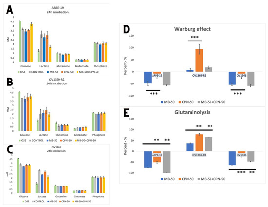Glutaminolysis and Warburg effect in ovarian cancer cells. (A–C) The glycolytic metabolic profile of cells was assessed under various treatment conditions, and the concentrations of glucose, lactate, glutamine, glutamate, and phosphate in the culture medium were measured after a 24 h treatment period. (D,E) Methylene blue treatment exerts inhibitory effects on both the Warburg effect and glutaminolysis in ARPE-19 and the chemo-sensitive OV1946 cell line. Specifically, MB significantly reduces the Warburg effect, as indicated by decreased lactate production and glucose consumption. Additionally, MB suppresses glutaminolysis, leading to reduced glutamate production and glutamine consumption. These metabolic alterations are consistent with the observed inhibition of cell proliferation. In contrast, the chemo-resistant OV1369-R2 cell line exhibited an opposing response to MB treatment. Here, MB slightly enhanced the Warburg effect and upregulated glutaminolysis. Notably, the combination of MB with carboplatin (CPN-50) did not significantly augment the Warburg effect. The opposite effect was observed on glutaminolysis, with a significant effect of drug combination (p ≤ 0.01). The adjusted p-value ≤ 0.05 were considered significant and the notations of ** (p ≤ 0.01), and *** (p ≤ 0.001) were used.