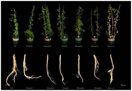 Benzoic acid stress significantly inhibited the growth of C. pilosula (Figure 1). Under benzoic acid stress, the leaves of C. pilosula exhibited yellowing, gradually transitioning from green to yellow. Meanwhile, the development of the root system of C. pilosula was severely hindered; it is worth noting that the roots noticeably turned yellow and the formation of fibrous roots increased. The phenomenon of yellowing of leaves and proliferation of fibrous roots shows a clear quantitative relationship, which intensifies with increasing concentration of benzoic acid. As the concentration of benzoic acid gradually increased from 50 mmol/L to 300 mmol/L, we determined that the appropriate concentration for benzoic acid stress was 200 mmol/L.