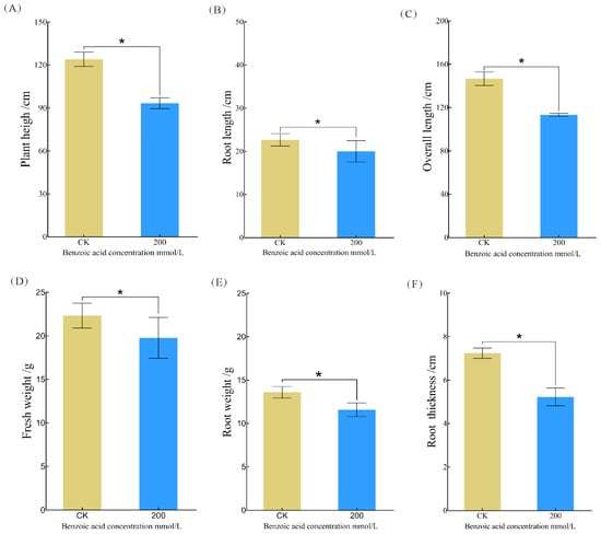 Morphological parametric assessments of C. pilosula upon exposure to benzoic acid at a concentration of 200 mmol/L: (A) Plant height; (B) root length; (C) total plant length; (D) fresh weight; (E) root weight; (F) root thickness. Note: “*” indicates significant differences between treatments at (p < 0.05).