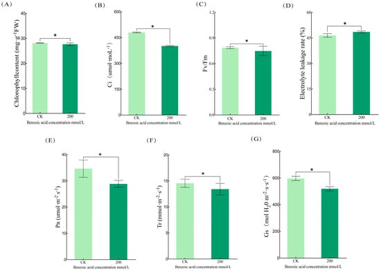 Photosynthetic parameters under varying concentrations of benzoic acid treatments: (A) chlorophyll content; (B) leaf electrolyte osmolality; (C) Fv/Fm ratio; (D) leaf intercellular CO2 concentration (Ci); (E) net photosynthetic rate (Pn); (F) leaf transpiration rate (Tr); (G) leaf stomatal conductance (Gs). Note: “*” indicates significant differences between treatments at (p < 0.05).