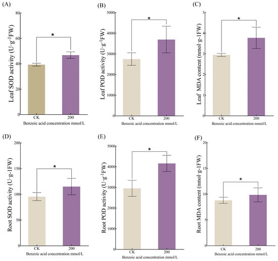 Plants engage their antioxidant defense mechanisms to counteract deleterious external circumstances and sustain oxidative equilibrium when exposed to stressors. The current investigation revealed a substantial upsurge in the concentrations of superoxide dismutase (SOD), malondialdehyde (MDA), and peroxidase (POD) within both the foliar and root of C. pilosula under benzoic acid treatment at a concentration of 200 mmol/L (Figure 4A–F). Markedly, the levels of SOD, MDA, and POD were elevated in the roots in contrast to those in the leaves. Specifically, the activity of SOD in the leaves and roots of the benzoic acid-treated group was augmented by 16% and 17%, respectively (p < 0.05), compared to the control group (Figure 4A,D). Furthermore, the activity of POD increased by 25.5% and 28.9%, respectively; concurrently, the content of MDA escalated by 20.5% and 11.22%, all statistically significant at (p < 0.05).