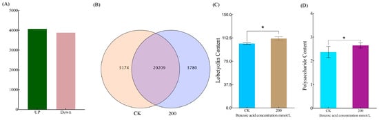 In order to explore the mechanism of benzoic acid on the growth of C. pilosula root system, transcriptome sequencing was performed on the roots treated with 200 mmol/L benzoic acid. Analysis of eukaryotic reference transcriptomes (RNA-seq) from six samples revealed that the number of upregulated genes exceeded the number of downregulated genes (Figure 5A). Transcriptome sequencing of C. pilosula showed that there were 20,209 genes commonly expressed in both CK and 200 mmol/L benzoic acid treatment groups, while each group specifically expressed 3174 and 3180 genes respectively (Figure 5B). After treatment with 200 mmol/L benzoic acid, there was a significant increase in the content of C. pilosula lobetyol and polysaccharides compared to CK (Figure 5C,D).