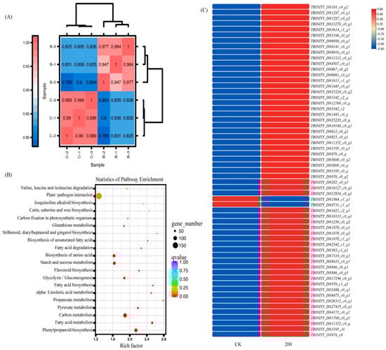 Heatmap illustrating sample expression correlation: (A) The magnitude of each color block represents the correlation between two samples along the x and y axes; the higher the magnitude, the stronger the correlation. (B) Bubble plot demonstrating KEGG enrichment analysis of differentially expressed genes in C. pilosula upon CK and benzoic acid (200 mmol/L) treatment: The size of the bubbles reflects the count of enriched genes, with larger bubbles indicating a greater abundance of enriched genes, and the bubble colors signify the enrichment significance—darker colors correspond to higher q-values, p ≤ 0.01 and fold change ≥ 1.2. (C) Distinctive expression profiles of genes encoding key enzymes in the kynurenine synthesis pathway in C. pilosula roots subjected to CK and benzoic acid (200 mmol/L) treatments.