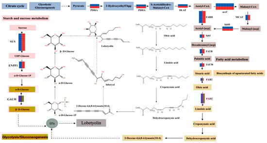 The biosynthesis of lobetyolin in C. pilosula traverses the citric acid cycle, glycolysis, and gluconeogenesis pathways. Acetoacetate undergoes conversion to 2-Hydroxyethylthioester (2-HydroxyethylThpp) by the enzyme pyruvate dehydrogenase complex (PDC). Subsequently, 2-Hydroxyethylthioester is transmuted into S-Acetyldihydromalonyl-CoA through the action of PDC, which is then transformed into acetyl-CoA by the enzyme fatty acyl-ACP thioesterase B (FABH), signifying the inception point of fatty acid synthesis. Acetyl-CoA forms an acetyl carrier (Acetyl-ACP) in conjunction with 3-oxoacyl-[acyl carrier protein] synthase II under the catalysis of FABH, and undergoes a succession of enzymatic reactions to engender a palmitoylcarrier (Hexadecanoyl-[ACP]). Under the impetus of Fatty acyl ACP thiosterase B (FATB), this palmitoyl carrier is successively converted into saturated fatty acid palmitic acid. Palmitic acid is further transfigured into stearic acid via an unsaturated fatty acid pathway catalyzed by Very Long Chain 3-Oxoacyl-CoA Reductase (IAF38), followed by its conversion to oleic acid under the regulation of acid-[acyl carrier protein] desaturase (FAB2). Oleic acid subsequently gives rise to linoleic acid under the influence of omega-6 fatty acid desaturase (FAD2). Linoleic acid can be metamorphosed to crepenynate by the action of Δ9 desaturase; moreover, Δ12 desaturase may introduce a new double bond at the Δ9 position of crepenynate, resulting in dehydrocupenynate. Dehydrocupenynate can be further processed into 2-Decene-4,6,8-triynoate (10:4) through pathways potentially encompassing β-Oxidation taking place within the mitochondria or peroxisomes of cells that eliminate carbon atoms from fatty acid chains through multiple cycles while generating acetyl-CoA. In the metabolic routes of starch and sucrose, sucrose undergoes conversion from sucrose synthase (SUS) to UDP-glucose, and is then transformed into α-D-Glucose-1P by external nucleotide pyrophosphatase (ENPP1). α-D-Glucose-1P participates in both glycolytic and gluconeogenic cycles, leading to its conversion into α-D-glucose which is subsequently converted to β-D-glucose facilitated by aldose 1-isomerase (GALM), furnishing precursors indispensable for the synthesis of lobetyolin in C. pilosula. Ultimately, glucose moieties are glycosidically linked with lobetyol alcohol under the catalytic effect of glycosyltransferases (GTs) to form C. pilosula lobetyol (Figure 7). Additionally, the results evidenced that the expression levels, quantified as FPKM values, of key regulatory enzyme-coding genes within these pathways were conspicuously upregulated under the stress imposed by 200 mmol/L benzoic acid treatment. Consequently, this study postulates that the biosynthesis of lobetyolinin C. pilosula is intimately associated with the differential expression patterns of key enzyme genes involved in the citric acid cycle metabolism as well as those governing fatty acid and starch/sucrose metabolism.