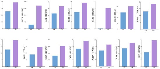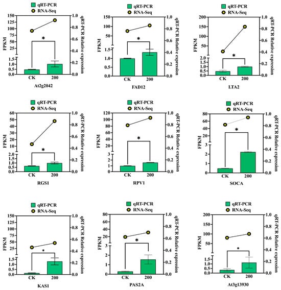 qRT-PCR analysis was conducted to examine the changes in DEGs in C. pilosula roots under CK and 200 mmol/L benzoic acid treatment. Nine DEGs that regulate key metabolic pathways were selected for qRT-PCR validation. The qRT-PCR values were compared with gene FPKM values to verify the reliability of transcriptomic data. “*” represents the results of Duncan’s multiple range test, indicating statistically significant differences (p < 0.05).