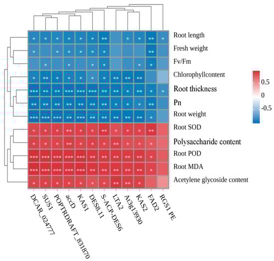 Dynamic correlation heatmap annotation. Note: “*” designates significant disparities between treatments (p < 0.05); “**” and “***” signify highly significant variances between treatments, (p < 0.01) and (p < 0.001) respectively.