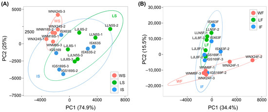 Principal component analysis (PCA) of broomcorn millet samples based on FPKM values of genes. (A) PCA plot of 18 samples of broomcorn millet at seedling stage. (B) PCA plot of 16 samples of broomcorn millet at filling stage excluding two outliers (WNM8F-2 and ZLN5F-3). Samples of wild types, landraces, and improved cultivars are indicated in red, green, and blue symbols, respectively. WS, LS, and IS indicate wild types, landraces, and improved cultivars at seedling stage, respectively; WF, LF, and IF present wild types, landraces, and improved cultivars at filling stage, respectively.