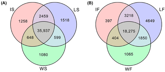 Venn diagram of genes expressed in wild types, landraces, and improved cultivars of broomcorn millets at seedling stage (A) and filling stage (B). WS, LS, and IS indicate wild types, landraces, and improved cultivars at seedling stage, respectively; WF, LF, and IF present wild types, landraces, and improved cultivars at filling stage, respectively.