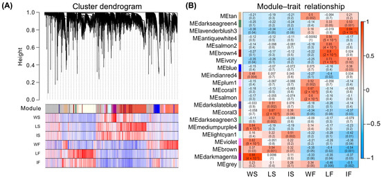 Detection of co-expression network in experimental groups of wild types, landraces, and improved cultivars of broomcorn millets at seedling and filling stages. (A) Hierarchical clustering tree of genes with assigned modules indicated. The main tree branches constitute 21 modules labeled by different colors, and the genes are represented by the leaves in the branches. The gray module is reserved for genes not assigned to any of the other 20 modules. WS, LS, and IS indicate wild types, landraces, and improved cultivars at seedling stage, respectively, and WF, LF, and IF present wild types, landraces, and improved cultivars at filling stage, respectively. (B) Associations between 21 modules (21 rows) and 6 traits (6 columns), i.e., WS, LS, IS, WF, LF, and IF. Each cell at the row–column intersection contains the correlation coefficient between the corresponding module and trait as well as the corresponding p values given in parentheses and are color-coded based on the color legend.