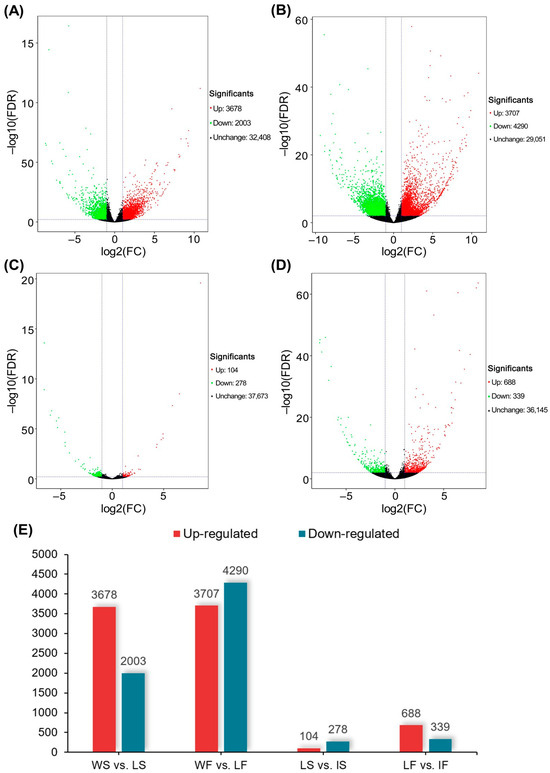 There were a total of 5681 (3678 up-regulated and 2003 down-regulated), 7997 (3007 up-regulated and 4290 down-regulated), 382 (104 up-regulated and 278 down-regulated), and 1027 (688 up-regulated and 339 down-regulated) DEGs detected, based on a false discovery rate (FDR) < 0.01 and |fold change (FC)| ≥ 2, in the comparative analyses of WS vs. LS, WF vs. LF, LS vs. IS, and LF vs. IF, respectively (Figure 4A–D). It was noted that the number of DEGs in wild types vs. landraces (WS vs. LS and WF vs. LF) was obviously much higher than that in landraces vs. improved cultivars (LS vs. IS and LF vs. IF) at both seedling and filling stages, while the total number of DEGs detected in samples at filling stage (WF vs. LF and LF vs. IF) was slightly higher than that of the samples at seedling stage (WS vs. LS and LS vs. IS) (Figure 4E).