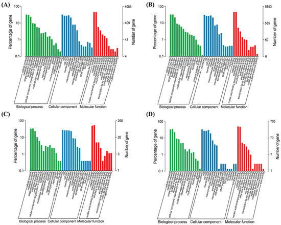 Gene Ontology (GO) annotation of differentially expressed genes (DEGs) detected in WS vs. LS (A), WF vs. LF (B), LS vs. IS (C), and LF vs. IF (D) of broomcorn millet. X-axis represents the GO terms of three categories, i.e., biological process, cellular component, and molecular function. Y-axis represent the number of DEGs annotated to the GO term (right) and percentage of number of DEGs annotated in all DEGs (left). WS, LS, and IS indicate wild types, landraces, and improved cultivars at seedling stage, respectively; WF, LF, and IF present wild types, landraces, and improved cultivars at filling stage, respectively.