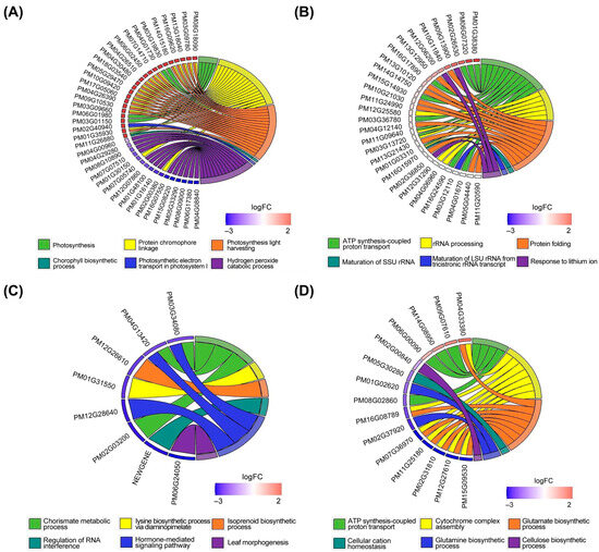 Then, a GO enrichment analysis based on DEGs was further performed to reveal the association between the enriched GO terms and the corresponding inclusion of DEGs (Figure 6). The results of a GO chord plot showed that a total of 23 up-regulated and 16 down-regulated DEGs of WS vs. LS were enriched in the top six GO terms (i.e., photosynthesis, protein chromophore linkage, photosynthesis light harvesting, chlorophyll biosynthetic process, photosynthetic electron transport in Photosystem I, and hydrogen peroxide catabolic process) (Figure 6A). Similarly, a total of 29 up-regulated DEGs of WF vs. LF were involved in the top six GO terms (including ATP synthesis-coupled proton transport, rRNA processing, protein folding, maturation of SSU rRNA, maturation of LSU rRNA from tricistronic rRNA transcript, and response to lithium ion). There were a total of eight down-regulated DEGs of LS vs. IS enriched in the top six GO terms (i.e., chorismate metabolic process, lysine biosynthetic process via diaminopimelate, isoprenoid biosynthetic process, regulation of RNA interference, hormone-mediated signaling pathway, and leaf morphogenesis). For DEGs of LF vs. IF, there were four up-regulated and eleven down-regulated DEGs enriched in the top six GO terms (ATP synthesis-coupled proton transport, cytochrome complex assembly, glutamate biosynthetic process, cellular cation homeostasis, glutamine biosynthetic process, and cellulose biosynthetic process). These results showed that there were much more enriched DEGs related to domestication (WS vs. LS and WF vs. LF) than those involved in improvement (LS vs. IS and LF vs. IF) of broomcorn millet. Furthermore, most domestication-related DEGs were up-regulated, while most improvement-related DEGs were down-regulated. For the up-regulated DEGs related to domestication, DEGs of WS vs. LS were mainly enriched in GO terms related to photosynthesis, while the DEGs of WF vs. LF were mainly enriched in GO terms related to rRNA synthesis, maturation, and transcription. It was also noted that the GO term ‘ATP synthesis-coupled proton transport’ was enriched by DEGs of both WF vs. LF and LF vs. IF, but not enriched by DEGs of WS vs. LS or LS vs. IS, indicating that this GO term was probably related to the filling stage of broomcorn millets during either domestication or improvement processes.