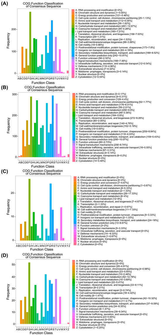 COG classification of differentially expressed genes (DEGs) detected in WS vs. LS (A), WF vs. LF (B), LS vs. IS (C), and LF vs. IF (D) of broomcorn millet. WS, LS, and IS indicate wild types, landraces, and improved cultivars at seedling stage, respectively; WF, LF, and IF present wild types, landraces, and improved cultivars at filling stage, respectively.