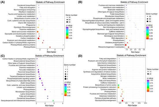 Kyoto Encyclopedia of Genes and Genomes (KEGG) metabolic pathway enrichment analysis of differentially expressed genes (DEGs) in WS vs. LS (A), WF vs. LF (B), LS vs. IS (C), and LF vs. IF (D) of broomcorn millet. The top 20 most enriched pathways are listed on Y-axis; the X-axis presents the enrichment factor based on the ratio of the proportion of the DEGs annotated to a pathway to the proportion of all genes annotated to the pathway. The color intensity of the dots stands for q value (adjusted p value), and the size of the dots represents the number of DEGs enriched in the pathway. WS, LS, and IS indicate wild types, landraces, and improved cultivars at seedling stage, respectively; WF, LF, and IF present wild types, landraces, and improved cultivars at filling stage, respectively.