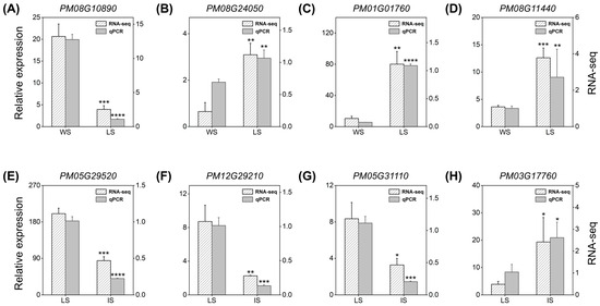 A total of eight genes (four DEGs related to domestication and four related to improvement) were selected for further qRT-PCR validation of the gene expression patterns based on an Illumina RNA-Seq analysis (Figure 9). The results revealed the consistent expression patterns of these genes between qRT-PCR and RNA-Seq analyses, i.e., four genes (PM08G24050, PM08G11440, PM01G01760, and PM03G17760) were significantly up-regulated and the other four genes (PM08G10890, PM05G29520, PM12G29210, and PM05G31110) were significantly down-regulated.