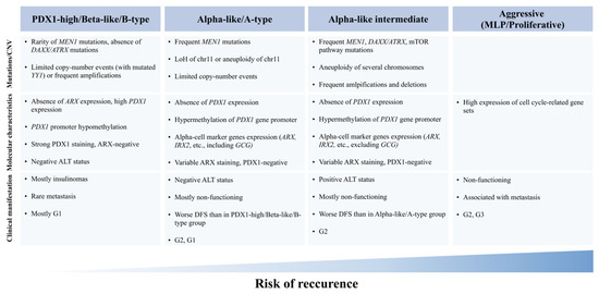 frequent amplifications, specifically in chromosome 4 and 14q, mutations in MEN1, DAXX, ATRX, mTOR-related genes----the worst relapse-free survivalnon-functionalG1, G2, G3-Alpha-like intermediate