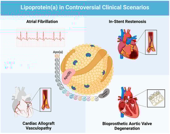 This review aims to thoroughly review the existing literature and provide an updated overview of the evidence surrounding the association of Lp(a) and atrial fibrillation, in-stent restenosis, cardiac allograft vasculopathy, and bioprosthetic aortic valve degeneration. We seek to highlight controversies in the existing literature and offer directions for future investigations to better understand Lp(a)’s precise role in these conditions (Figure 1).