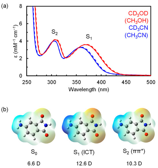 (a) Electronic absorption spectra of 4-AP in CD3OD (solid red line), CH3OH (dashed red line), CD3CN (solid blue line), and CH3CN (dashed blue line) at room temperature. Two bands were assigned to the transitions to the S1 and S2 states, as shown in the figure. (b) ESPs of the S0, S1, and S2 states obtained from TD-DFT calculations using the ωB97XD functional and the pcseg-1 basis set. The blue and red clouds represent more positive and negative potentials, respectively. The S1 state is more polarized and significantly different from the S0 state, consistent with the assignment of the S1 state to the ICT state. Dipole moments calculated using the ωB97XD/pcseg-1 are also given.