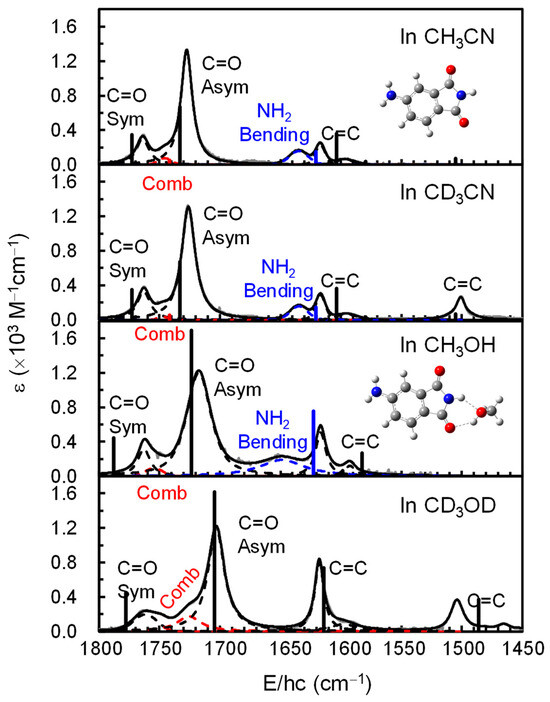 Figure 2 shows the equilibrium Fourier transform infrared (FT-IR) spectra of 4-AP in undeuterated and deuterated acetonitrile and methanol at room temperature. It was found that CH3CN and CH3OH exhibit strong absorption bands at ~1400 cm−1 due to the CH3 bending mode, which also produces an absorbance of >0.5, even at 1550 cm−1 under the current conditions. As a result, the measured sample absorbance is unreliable below 1550 cm−1 and so the data for this spectral region are not shown for 4-AP in CH3CN and CH3OH. Consequently, deuterated solvents were used to extend the spectral region up to 1450 cm−1. Although the deuterated solvent altered the vibrational spectrum of 4-AP in methanol, the vibrational spectrum of 4-AP in CD3CN was almost identical to that in CH3CN. Based on these results, it is apparent that the electronic and vibrational transitions of 4-AP are not affected by the deuteration of acetonitrile; thus, only the solution of 4-AP in CD3CN was considered hereafter for the sake of simplicity. In contrast, solutions of 4-AP in both CD3OD and CH3OH are investigated due to the differences in their vibrational spectra. The two major bands at 1763 and 1703 cm−1 in CD3OD, 1763 and 1718 cm−1 in CH3OH, and 1763 and 1726 cm−1 in CD3CN correspond to the symmetric and asymmetric C=O stretching modes of 4-AP, respectively. The band positions for the symmetric C=O stretching mode are identical in acetonitrile and methanol, whereas the bands corresponding to the asymmetric C=O stretching mode were found to be solvent dependent. DFT calculations performed for 4-AP in the presence of one methanol molecule showed that methanol is hydrogen bonded to 4-AP (optimized structure in Figure 2). In addition, these calculations show that the asymmetric C=O stretching mode undergoes a red-shift, indicating that this band originates from hydrogen bonding between methanol and the C=O and imine moieties of 4-AP. The asymmetric C=O band of 4-AP in CD3OD is even more red-shifted than that in CH3OH due to the deuteration of the 4-AP amine and imine groups. As can be seen in Figure 2, the signals corresponding to NH2 bending of 4-AP in CD3CN and CH3OH (i.e., at 1635 and 1649 cm−1, respectively) are absent in CD3OD due to the deuteration of the amine group. The remaining bands at 1618, 1598, and 1504 cm−1 in CD3OD, 1617 and1593 cm−1 in CH3OH, and 1617, 1597, and 1501 cm−1 in CD3CN correspond to the C=C stretching modes of the 4-AP benzene ring. The small band at ~1750 cm−1 (red dashed lines in Figure 2) was assigned to a combination of NH2 scissoring (or C–N–C stretching in CD3OD) and OC–N–CO scissoring. These distinctive bands of 4-AP in the 1800–1450 cm−1 region were used as reference peaks in the vibrational analysis of the excited state due to the fact that they are observable in the same region across all IR spectra, even in the presence of the tautomerized compound.