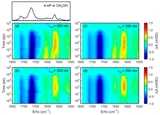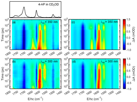 One key objective of this work was to establish a detailed picture of the roles of different electronic states in the solvent-assisted ESIPT process of 4-AP in protic solvents. The electronic absorption spectra (Figure 1) demonstrated the possibility of selective photoexcitation from the S0 state of 4-AP to either the S2 or S1 state. The TRIR spectra of 10 mM 4-AP solutions in CD3OD and CH3OH were recorded at 293 K over the spectral ranges of 1800–1450 and 1800–1550 cm−1, respectively. More specifically, the spectra were recorded from 0.3 ps to 100 ns after excitation with a 350 or 300 nm pulse, and the resulting two-dimensional (2D)-contour maps are displayed in Figure 3 and Figure 4. The TRIR spectra clearly display evolving negative-going (blue) and positive-going (red) features. The negative-going features (bleach), appearing immediately after photoexcitation and having the same band positions as the equilibrium absorption spectrum of 4-AP, arise from population depletion of the ground state upon photoexcitation. The amplitudes of the bleach bands decreased over time, essentially disappearing within 100 ns, suggesting that the depleted ground-state population recovered within this timeframe. Some new absorption features also developed immediately after photoexcitation, while others appeared later. However, all absorption features were observed to decay during the bleach recovery time, suggesting that all excited states relax or new species return to the reactant within the 100 ns period.