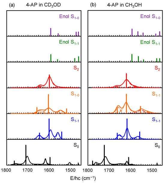To explore the possible formation of Enol 4-AP after photoexcitation via solvent-assisted ESIPT, the spectra of Enol 4-AP were calculated in the S1 state before and after full optimization of the solvent configuration to Enol 4-AP in the S1 state, denoted as Enol S1-0 and Enol S1-1, respectively. The basis spectra denoted as S0, S1-0, S1-1, and S2 represent the spectra of the keto form of 4-AP in various electronic states. As shown in Figure 5, the calculated spectral features of Enol 4-AP in the S1 state are quite different from those of the keto form, being significantly red-shifted and showing congestion in the lower frequency region. These observations indicate that, when present, Enol 4-AP can be readily distinguishable in the TRIR spectra. No distinct absorption features were observed in the TRIR spectral region < 1540 cm−1 (see Figure 3) wherein the presence of Enol 4-AP should be evident. This indicates that ESIPT does not proceed in a methanolic solution of 4-AP excited at either 350 or 300 nm.