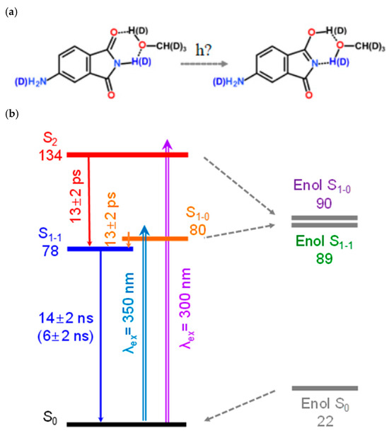 4-AP is known to exhibit strong solvatochromism. This was attributed to the significant increase in the dipole moment of its excited state relative to the ground state [21], the formation of stronger hydrogen bonds with protic solvents in the excited state [12,22], and/or the formation of the enol form of 4-AP (Enol-4-AP) as a result of solvent-assisted ESIPT [10,23,24,25]. ESIPT in 4-AP was revoked by showing the same behavior as 4-AP in 4-AP derivatives wherein an n-alkyl group replaces the imide hydrogen atom [26]. Later, Durantini et al. reported that 4-AP undergoes solvent-assisted ESIPT from the imino/amino group to the carbonyl group, leading to a keto–enol tautomerization in the excited state following excitation at 300 nm [10]. However, ESIPT of 4-AP in the excited state by excitation at 300 nm was also revoked by a comparative experiment on 4-AP and 4-AP derivatives wherein the hydrogen atom of the imino group is replaced by an n-butyl group [27]. Although the controversial observation of ESIPT in 4-AP has been extensively investigated, the molecular mechanism that defines the feasibility of this process has yet to be examined.