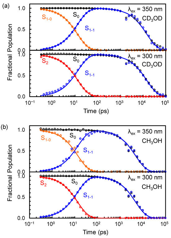 As can be seen in Figure 6b, the solvent configuration is fully optimized to 4-AP in the S1 state with a time constant of 13 ± 2 ps. This state remains until it relaxes into the S0 state with time constants of 14 ± 2 and 6 ± 2 ns in CD3OD and CH3OH, respectively. Since all excited 4-AP species are in the S1 state upon 350 nm excitation, the excited 4-AP at this wavelength undergoes a simple relaxation to the S0 state following picosecond optimization of the solvent configuration to 4-AP in the excited S1 state (Figure 6b). The excitation of 4-AP at 350 nm represents an ICT transition, which results in a significant change in the dipole moment (∆μ ≈ 6 D) and the ESP (Figure 1). Immediately after photoexcitation, 4-AP reaches the S1 state, residing in non-relaxed solvent environments since the solvent molecule configuration remains in the S0 state. As the solvent molecules become reorganized based on the new charge distribution of 4-AP in the S1 state, 4-AP becomes stabilized. The time constant of 13 ± 2 ps for the S1-0 → S1-1 transition, therefore, represents the solvent reorganization time of methanol and is comparable to the dielectric relaxation time of methanol measured by the time-resolved fluorescence Stokes shift method (i.e., 17 ps) [38], thereby consolidating the current experimental data. The solvent reorganization time of CD3OD was identical to that of CH3OH, as was its internal conversion time from the S2 to the S1 state of 4-AP. As shown in Figure 5, solvent reorganization manifested as spectral evolution and dynamic peak shifts of the bands in the S1-0 to S1-1 basis spectra. Fluorescence decay measurements identified the excited state lifetime of 4-AP in CH3OH to be ~7 ns [11], which was proposed to be ~3 times lower than that in CD3OD [27]. Therefore, the S1-1 lifetimes in CD3OD and CH3OH (i.e., 14 ± 2 and 6 ± 2 ns, respectively) were consistent with the previously reported values.