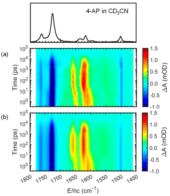 To differentiate between the possible solvent-assisted ESIPT of 4-AP in the excited S2 state, the dynamics of 4-AP were investigated in a polar aprotic solvent excited at 300 nm. More specifically, the TRIR spectra of a 10 mM 4-AP solution in CD3CN were obtained between 1800 and1450 cm−1 and at 293 K over a wide time range of 0.3 ps to 100 ns after excitation with a 300 nm pulse; the corresponding 2D contour map is shown in Figure 8. As described above, the early dynamics of 4-AP are expected to be the same in CD3CN and CH3CN because the electronic and vibrational spectra of 4-AP are not affected by deuteration. Since the spectral window is broader in CD3CN, experiments were performed for a solution of 4-AP in this solvent. From Figure 8, it can be seen that the negative-going features, which appeared immediately after photoexcitation, matched well with the bands in the equilibrium FT-IR spectrum of 4-AP in CD3CN; positive-going features, appearing immediately or later, evolved over time. The TRIR spectra were globally fitted using the three basis spectra presented in Figure 9a, namely the equilibrium FT-IR spectrum of 4-AP in CD3CN (S0), the spectrum of 4-AP in the S1 state (S1), and the spectrum of 4-AP in the S2 state (S2). Since the dielectric relaxation time of acetonitrile is known to be ~0.2 ps [43], the solvent reorganizes immediately to the new electronic configuration upon electronic excitation. Consequently, all of the observed spectra for 4-AP in CD3CN exhibited a fully optimized solvent configuration in the electronic state; thus, all spectra recorded in acetonitrile were denoted as Sn.
