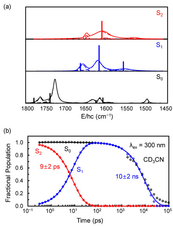 (a) Basis spectra used to fit the TRIR spectra of 4-AP in CD3CN excited at 300 nm. The basis spectrum for S0 represents the equilibrium FT-IR spectrum of 4-AP in CD3CN. The basis spectra for the S2 and S1 states were obtained by optimizing the calculated vibrational band (vertical lines with scale factors of 0.937–0.975) in acetonitrile to globally fit the TRIR spectra of 4-AP in CD3CN. The spectra denoted as S1 and S2 represent the spectra of 4-AP with a fully optimized solvent configuration to its corresponding electronic state since the solvent reorganization time of acetonitrile is ~0.2 ps [43]. (b) Time-dependent fractional population changes in the various species involved in the excitation of 4-AP in CD3CN at 300 nm. The fractional population changes are color-coded: The red circles and line represent the fractional population of 4-AP in CD3CN in the S2 state, while the blue elements represent the fractional population in the S1 state. The black circles and line represent the fractional population change in the depleted 4-AP in CD3CN after excitation at 300 nm. Data for the fractional population changes (open circles), were obtained from the time-dependent amplitude changes in the basis spectra and the fitted integrated extinction coefficients of the corresponding basis spectra. These data are well described by the Figure 6b shown in Figure 6b with time constants of 9 ± 2 ps and 10 ± 2 ns for the S2 → S1 and S1 → S0 transitions, respectively (solid lines).