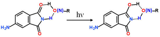 The structure of 4-aminophthalimide (4-AP) contains electron acceptor moieties (>NH and –NH2) that are conjugated with an electron donor moiety (>C=O) in an aromatic ring. Consequently, its electron density changes significantly upon electronic excitation [10]. 4-AP can form a six-membered ring hydrogen bonding configuration with protic solvents, and this configuration can serve as a precursor for solvent-assisted ESIPT (Scheme 1). In addition, 4-AP is highly fluorescent in nonpolar solvents and its fluorescence quantum yield remains high (0.76–0.63) regardless of the polarity in aprotic solvents; however, the fluorescence yield drops dramatically in protic solvents [11]. The fluorescence spectra and lifetimes of 4-AP are also sensitive to the molecular environment [10,12,13,14,15,16]. Furthermore, 4-AP shares some important structural features with the nucleic acid bases, including the ability to undergo hydrogen bonding with protic solvent molecules and with itself. It has also been reported that 4-AP is approximately isosteric to tryptophan, a weakly fluorescent probe used in peptides and proteins, although the former exhibits a stronger fluorescence [17]. Consequently, 4-AP has been extensively employed as a strong fluorescent probe in various environments, including biological systems, nanomaterials, and polymers, since it can be readily incorporated into larger molecules without any significant changes in its fluorescence properties [10,16,18,19,20].