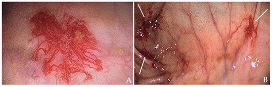 The prevalence of colonic angiodysplasia in healthy, asymptomatic individuals is very low (0.83%); the lesions are smaller than 10 mm, and the natural course of the condition is benign, with a three-year bleeding rate of 0% per one study [57]. Small-bowel angiodysplasia mostly has the same course, with no negative impact on patient survival [58]. The presence of a dilated blood vessel in the mucosa of the digestive tract can lead to gastrointestinal bleeding, which is a common occurrence in angiodysplasias, either from the upper or lower gastrointestinal tract [59,60]. Angiodysplasias are the most common cause of occult bleeding from the small bowel in older patients [61].