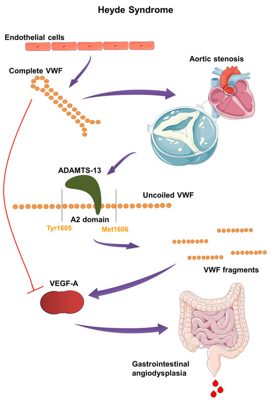 Pathogenesis and molecular mechanism of Heyde syndrome: The narrowed aortic valve increases shear stress on VWF, causing its multimers to uncoil and elongate. This exposes the A2 domain, making VWF susceptible to cleavage by ADAMTS13 enzyme. The resulting smaller VWF fragments lose their hemostatic function and fail to inhibit VEGF. The loss of VEGF inhibition leads to abnormal blood vessel formation, or angiodysplasia, particularly in the gastrointestinal tract, causing bleeding.