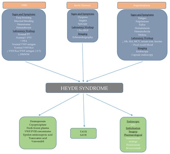 Regarding the treatment of AVWD in Heyde syndrome, tranexamic acid may be a possible option for managing chronic bleeding due to angiodysplasias. Grooteman et al. administered 1000 mg of tranexamic acid daily after unsuccessful treatment with octreotide and thalidomide in a patient with chronic recurrent bleeding, which resulted in stabilized hemoglobin levels and a reduced need for transfusions [116].