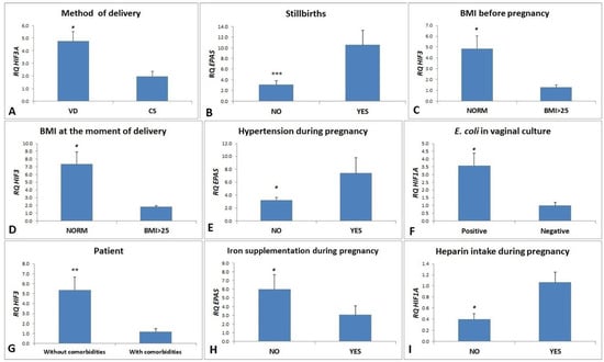 (A) Average expression of the HIF3 gene (RQ ± SE) in the cellular fraction of breast milk depending on the method of delivery, (B) Average expression of the EPAS1 gene (RQ ± SE) in the cellular fraction of breast milk depending on the occurrence of stillbirths in previous pregnancies, (C) Average expression of the HIF3A gene (RQ ± SE) in the cellular fraction of breast milk depending on the BMI before pregnancy, (D) Average expression of the HIF3A gene (RQ ± SE) in the cellular fraction of breast milk depending on the BMI at the moment of delivery, (E) Average expression of the EPAS1 gene (RQ ± SE) in the cellular fraction of breast milk depending on the occurrence of hypertension during the pregnancy, (F) Average expression of the HIF1A gene (RQ ± SE) in the cellular fraction of breast milk depending on the presence of Escherichia coli in vaginal culture, (G) Average expression of the HIF3 gene (RQ ± SE) in the cellular fraction of breast milk depending on the presence of comorbidities, (H) Average expression of the EPAS1 gene (RQ ± SE) in the cellular fraction of breast milk depending on the iron supplementation by the patient, (I) Average expression of the HIF1A gene (RQ ± SE) in the cellular fraction of breast milk depending on the heparin treatment, * p < 0.05, ** p < 0.01, *** p ≤ 0.001 as determined by a Mann–Whitney U test.
