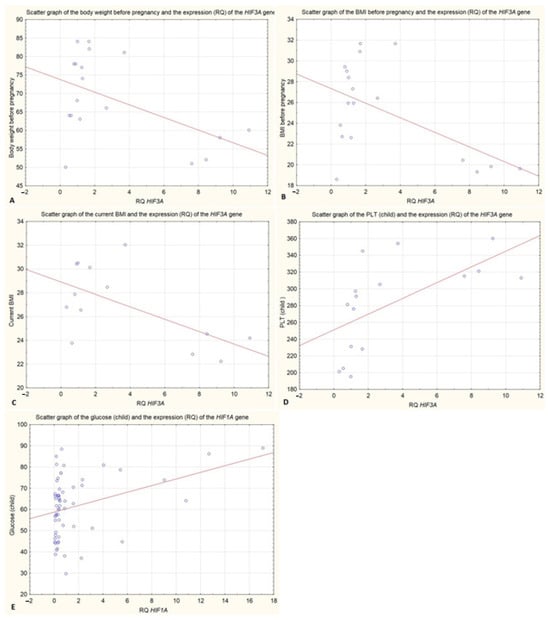 (A) Scatter graph of the body weight before pregnancy and the expression (RQ) of the HIF3A gene in the cellular fraction of breast milk (r = −0.509 p < 0.05); (B) Scatter graph of the BMI before pregnancy and the expression (RQ) of the HIF3A gene in the cellular fraction of breast milk (r = −0.509 p < 0.05); (C) Scatter graph of the current BMI and the expression (RQ) of the HIF3A gene in the cellular fraction of breast milk (r = −0.509 p < 0.05); (D) Scatter graph of the PLT (child) and the expression (RQ) of the HIF3A gene in the cellular fraction of breast milk (r = −0.509 p < 0.05); (E) Scatter graph of the glucose (child) and the expression (RQ) of the HIF1A gene in the cellular fraction of breast milk (r = −0.509 p < 0.05) Spearman’s Rank Correlation.