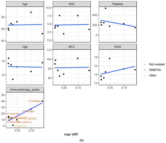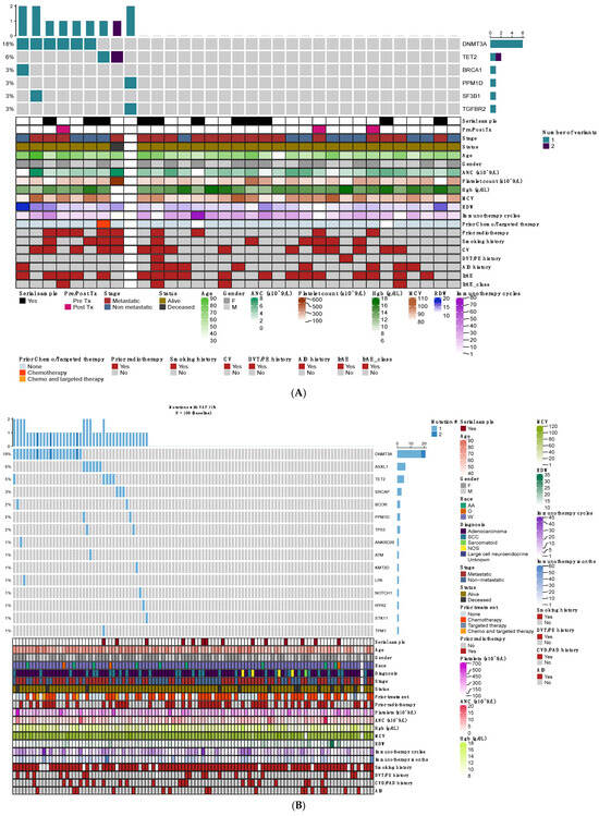 - Miller, P.G.; Gibson, C.J.; Mehta, A.; Sperling, A.S.; Frederick, D.T.; Manos, M.P.; Miao, B.; Hacohen, N.; Hodi, F.S.; Boland, G.M.; et al. Fitness Landscape of Clonal Hematopoiesis Under Selective Pressure of Immune Checkpoint Blockade. JCO Precis. Oncol. 2020, 4, 1027–1033. [Google Scholar] [CrossRef]
