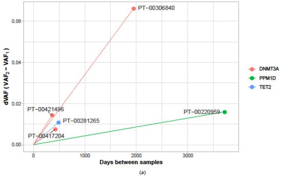 - Fabre, M.A.; de Almeida, J.G.; Fiorillo, E.; Mitchell, E.; Damaskou, A.; Rak, J.; Orrù, V.; Marongiu, M.; Chapman, M.S.; Vijayabaskar, M.S.; et al. The longitudinal dynamics and natural history of clonal haematopoiesis. Nature 2022, 606, 335–342. [Google Scholar] [CrossRef]