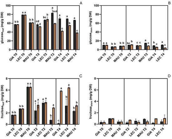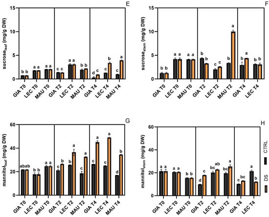 Sugar levels identified by HPLC in Giarraffa (GIA), Leccino (LEC) and Maurino (MAU) under control (CTRL, black) and drought stress (DS, orange). (A) Glucose in leaf; (B) glucose in stem; (C) fructose in leaf; (D) fructose in stem; (E) sucrose in leaf; (F) sucrose in stem; (G) mannitol in leaf; (H) mannitol in stem, all expressed in mg g−1 tissue dry weight (DW). Data in each column are presented as mean ± standard error. Within each time point, different letters denote statistical significance (p-value < 0.05) according to Tukey’s multiple post hoc tests.
