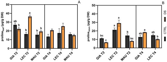 Proline content in leaves (A) and stems (B) of Giarraffa (GIA), Leccino (LEC), and Maurino (MAU) cultivars under control (CTRL, black) and drought stress (DS, orange). Contents are expressed as μg g−1 tissue dry weight (DW). Values in each column are presented as mean ± standard error. Within each time point, different letters denote statistical significance (p-value < 0.05) according to Tukey’s multiple post hoc tests.