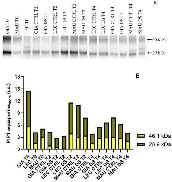 Blots relative to aquaporins revealed three or more bands, but only the two most distinct bands (46 and 29 kDa) were quantified (Figure 3A). Densitometric analysis (Figure 3B) showed significant variation in protein concentrations among the experimental groups. At t0, ‘Giarraffa’ exhibited higher PIPs1 content than the other cultivars, but this content decreased at later time points. In stressed stem samples, PIPs1 accumulation in ‘Giarraffa’ was lower at t2 but higher at t4 compared to controls. The stressed groups of the ‘Leccino’ cultivar accumulated significantly more PIPs1 than the controls at both t2 and t4. Conversely, ‘Maurino’ accumulated fewer PIPs1 in the stressed groups than in the controls at both time points.