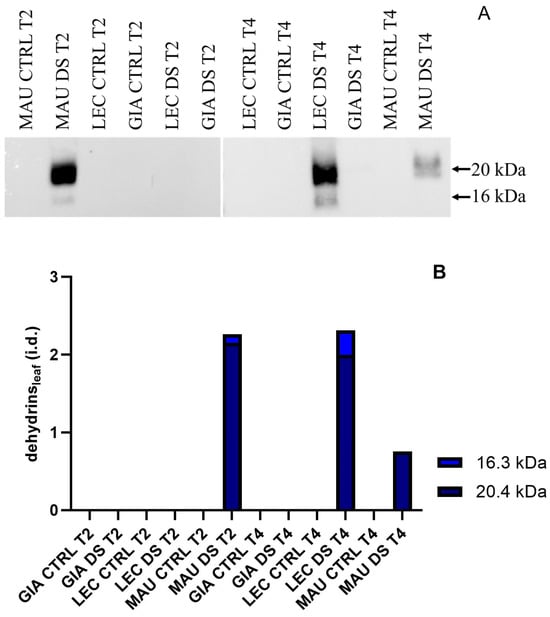 Dehydrin levels in leaves of Giarraffa (GIA), Leccino (LEC) and Maurino (MAU) cultivars after two (t2) and four (t4) weeks of stress. (A) Membranes immunoblotted with anti-dehydrin antibodies from the above experimental groups; (B) relative quantification of the blots expressed as integrated density (i.d.).