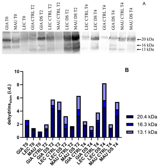 Dehydrin levels in stems of Giarraffa (GIA), Leccino (LEC) and Maurino (MAU) cultivars under control (CTRL) and drought-stress (DS) conditions, at the beginning of stress (t0), two weeks later (t2) and four weeks later (t4). (A) Membranes immunoblotted with anti-dehydrin antibodies from the above experimental groups; (B) relative blotting quantification expressed as integrated density (i.d.).