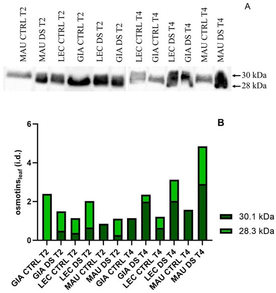Figure 6 shows osmotin blots on leaves. Two isoforms, at 30 and 28 kDa, were identified (Figure 6A), although they were difficult to distinguish. As shown by the relative quantification in Figure 6B, at t4 osmotin was highly accumulated in the stressed groups of all cultivars, with ‘Maurino’ DS showing the highest accumulation. At t2, ‘Giarraffa’ DS showed lower osmotin levels than the control group, in contrast to ‘Leccino’ and ‘Maurino’.