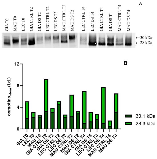 In stems, two bands, at 30 kDa and 28 kDa, were consistently detected (Figure 7A). The relative levels (Figure 7B) showed that all cultivars reduced the accumulation of osmotin at t2. While ‘Giarraffa’ DS maintained a low level of osmotin also at t4, osmotin accumulation increased in ‘Maurino’ DS and ‘Leccino’ DS.