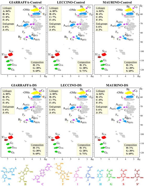 Figure 8 shows that the HSQC spectra (δC/δH 50–125/2.4–7.8) of all experimental groups revealed signals from carbohydrates (gray color) and lignin, as indicated by aromatic rings from guaiacyl (G) and syringyl (S) lignin units, including Cα-oxidized S-lignin units (S′). After increasing the threshold, only a weak signal for p-hydroxyphenyl (H) units was detected. In the aliphatic-oxygenated region of the spectra, typical signals from the Cα/Hα, Cβ/Hβ, and Cγ/Hγ correlations of the different interunit linkages (β-O-4′ alkyl-aryl ethers, A; β-5′ phenylcoumarans, B; β-β′ resinols, C; β-1′ spirodienones, F) and cinnamyl alcohol (I) end-groups were observed.
