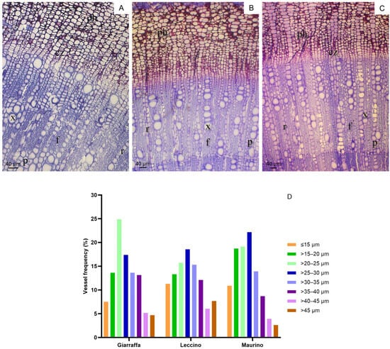 Stem sections of Olea europaea cultivars Giarraffa (A), Leccino (B), and Maurino (C). ph: phloem, x: xylem vessels; cz: cambial zone; r: parenchyma ray; f: fibers; p: paratracheal parenchyma; bar corresponds to 20 µm. (D) Frequency distributions (number of vessels by 5 µm diameter) of vessel lumen diameters in the three olive cultivars.