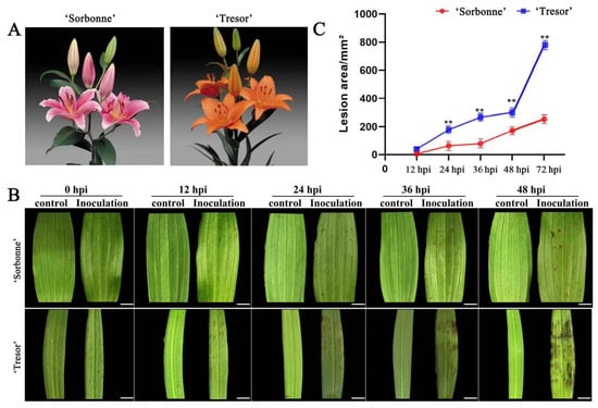 (A) Oriental hybrid ‘Sorbonne’ and Asiatic hybrid ‘Tresor’. (B) Leaf phenotype of ‘Sorbonne’ and ‘Tresor’ after infection with B. elliptica, scale bar = 1 cm. (C) Leaf lesion size over time of ‘Sorbonne’ and ‘Tresor’ after infection with B. elliptica, n = 12. The lesion areas are shown as the means of the three biological replicates ± SD. Asterisks indicate statistically significant differences between resistant and susceptible cultivars according to Student’s t-test (** p < 0.01).