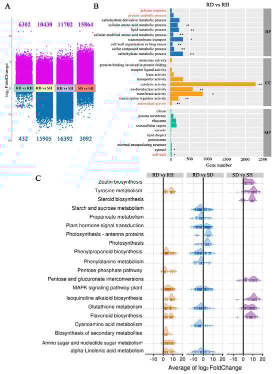 (A) Identification and functional enrichment analysis of DEGs in lily. (A) Volcanic plots of DEGs. Red and blue points represent the up-regulated and down-regulated DEGs, respectively. RD and SD represent B. elliptica-inoculated samples of ‘Sorbonne’ and ‘Tresor’, respectively. RH and SH represent the controls of ‘Sorbonne’ and ‘Tresor’, respectively. (B) GO enrichment analysis of the DEGs detected in B. elliptica-infected ‘Sorbonne’ compared with its control. Red texts represent four defense-related terms that were specifically enriched in ‘Sorbonne’ after infection relative to ‘Tresor’. * p < 0.05, ** p < 0.01. (C) The ridge plot of KEGG enrichment analysis for the DEGs. The average log2FoldChange value of each gene in the pathway is shown in the ridge plot. If the value is greater than 0, the gene is the upregulated (right), and the gene is downregulated (left) if its value is less than 0. Three biological replicates were used for transcriptomic analysis.
