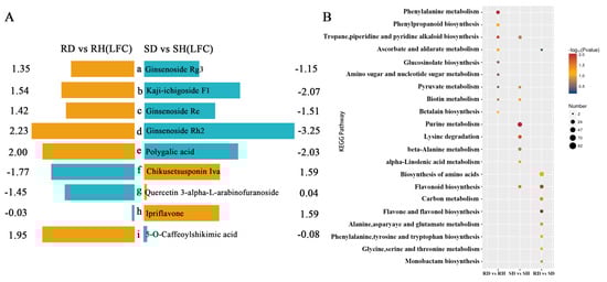 KEGG enrichment analysis of DAMs and in-depth analysis of key metabolites. (A) Six DAMs (a–f) with opposite accumulation patterns in ‘Sorbonne’ and ‘Tresor’ after infection with B. elliptica and three DAMs (g–i) were particularly accumulated in ‘Sorbonne’ or ‘Tresor’ after infection with B. elliptica. The horizontal axis indicates the value of log2FoldChange. Orange bars represent up-regulated DAMs, and blue bars represent the down-regulated DAMs. (B) KEGG enrichment analysis for DAMs.