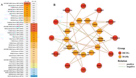 The identification and classification of the TFs were based on PlnTFDB [] and PlantTFDB []. The DETFs were further screened. Cytoscape software version 3.6.1 was used to construct transcriptional regulatory networks for the DETFs and DAMs. Significant regulatory relationships between the DETFs and DAMs were determined by a Pearson correlation coefficient > 0.9 or <−0.8 and a p value < 0.05.